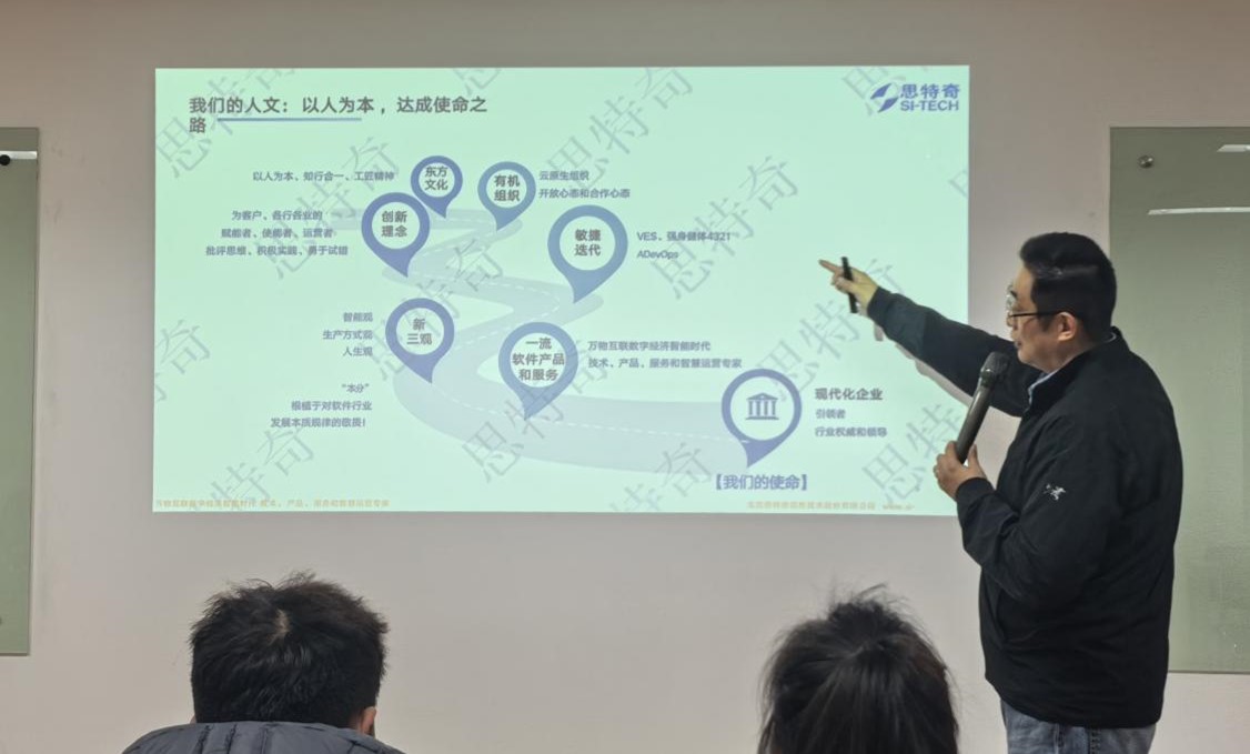 孙浩先生先后任职大唐电信研发的部门经理、北京青年中交BSS事业部总经理及北京思特奇运营部总经理, 其个人不仅拥二十几年大型央企及上市公司企业经营与运营管理经验,还不断深耕 ICT 行业,在电信运营商、智慧城市、产业互联等领域成功主导多个公司数智化转型项目。孙浩先生基于思特奇的业务发展脉络,深刻分解了企业从初期到每次变革的经历路程,向在座的老师与同学们分享企业创新实践中的实际困难与挑战,同时也展示出思特奇三十年依然稳居市场的韧性与魄力。