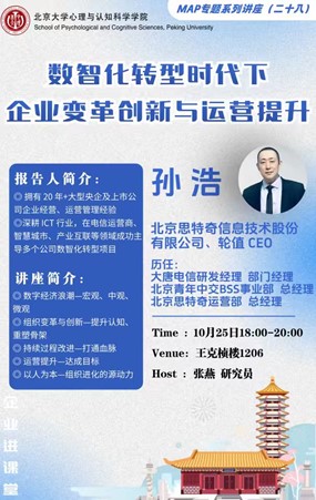 2025年10月25日晚,心理与认知科学学院在王克桢楼1206会议室成功举办了第二十八期“应用心理硕士MAP项目专题系列讲座”,讲座由管理与社会心理学系副主任张燕研究员主持。本次讲座以“数智化转型时代下,企业变革创新与运营提升”为主题,特邀北京思特奇信息技术股份有限公司轮值CEO孙浩先生作为主讲嘉宾,与在场的MAP项目在读研究生、部分博士生分享了讲座的核心内容,包括数字经济浪潮、组织变革与创新、运营提升等,并结合实例阐述如何进行过程变革,如何以人为本为组织进化提供源动力。