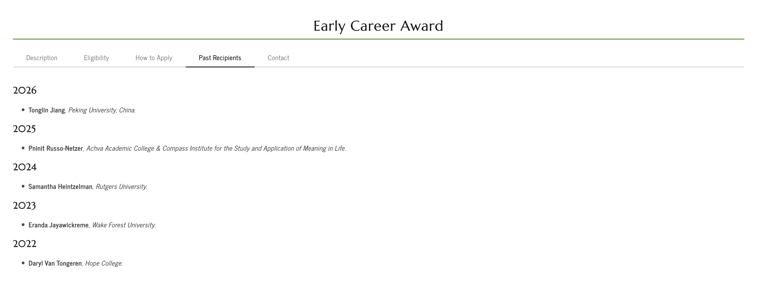 国际存在心理学科学学会(ISSEP)是美国人格与社会心理学会(SPSP)下属分会,是致力于用实证科学方法研究存在主义心理过程的全球首要学术组织。其“早期职业贡献奖”面向全球遴选并表彰在存在心理学实证研究中展现突出创新力、学术潜力与国际影响力的青年学者。