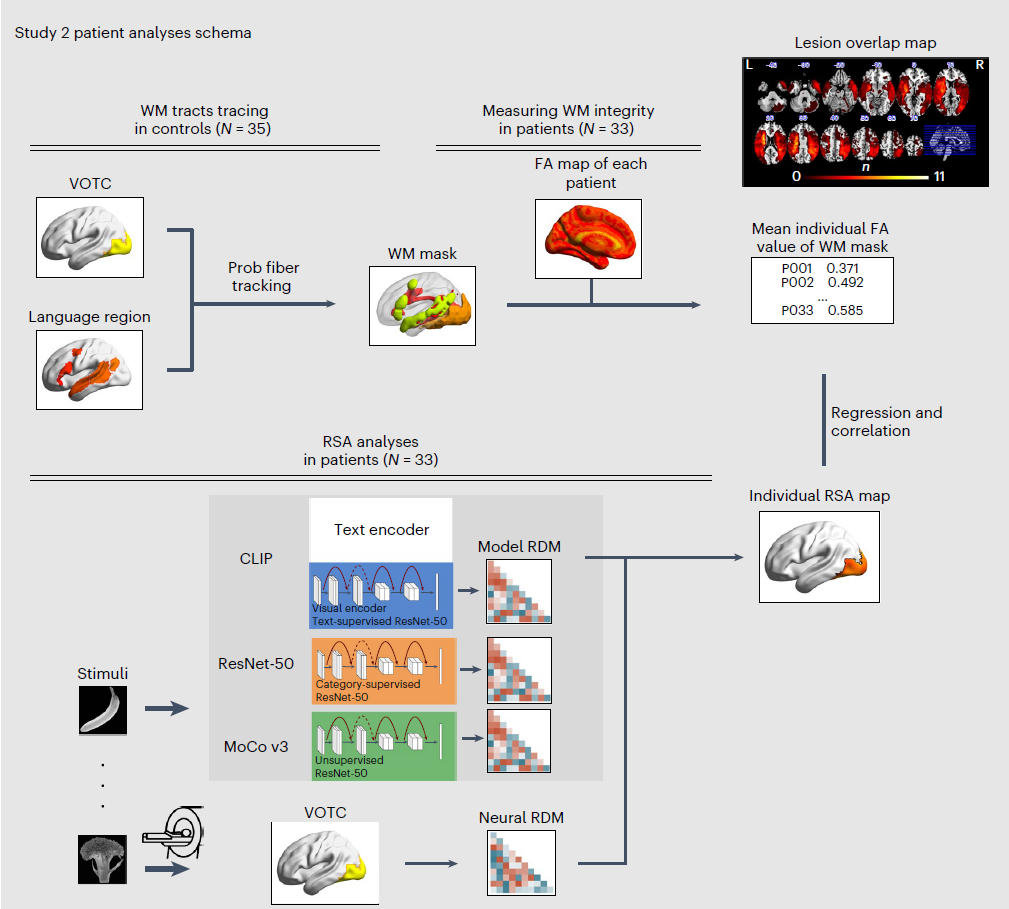 为进一步约束机制解释并接近“因果链条”,研究在 33 名慢性脑卒中患者中开展结构连接分析:患者在完成与 FV14 相同的任务 fMRI 的同时采集 HARDI数据;研究者量化连接 VOTC 与语言网络关键节点之间白质纤维束的完整性,并在控制总病灶体积等协变量的前提下,检验结构完整性与模型—脑对应关系之间的关联。